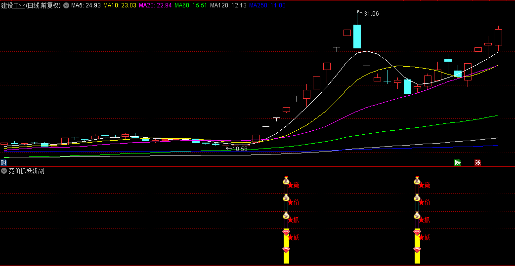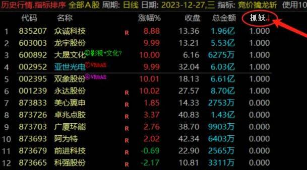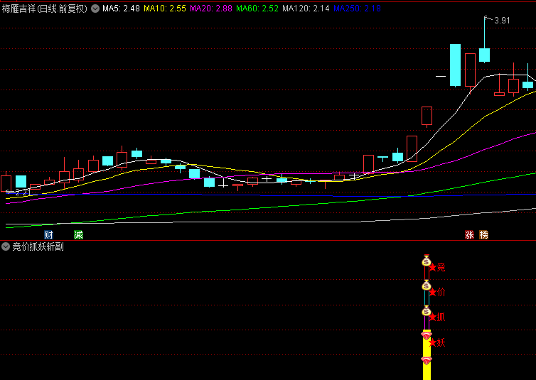 在副图上,这一信号通过不同颜色的柱状线和图标进行直观展示,如红色、洋红色、淡蓝色和黄色的柱状线,以及特定位置的图标和文字标注,使投资者能够一目了然地识别出符合“竞价抓妖斩”指标的股票。
