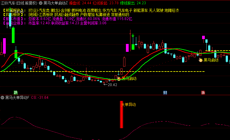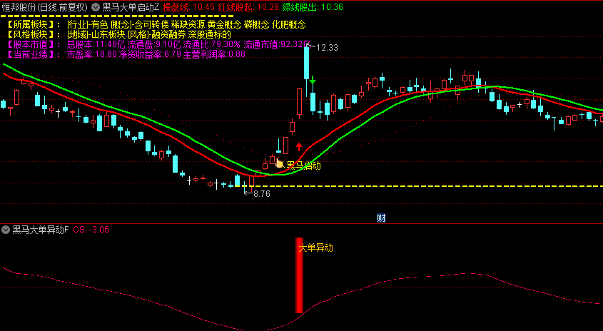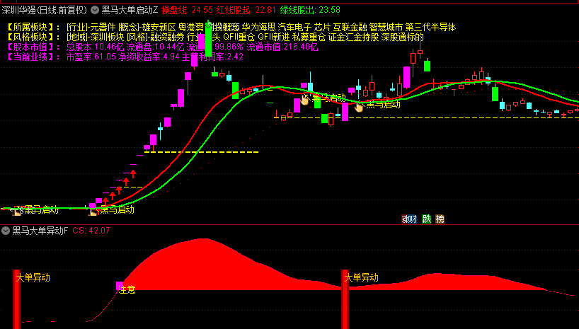 黑马大单启动主图指标在主图上集成了丰富的股票基本面和技术面信息,包括所属板块、风格板块、股本市值、当前业绩等,该公式副图选股不含未来函数!