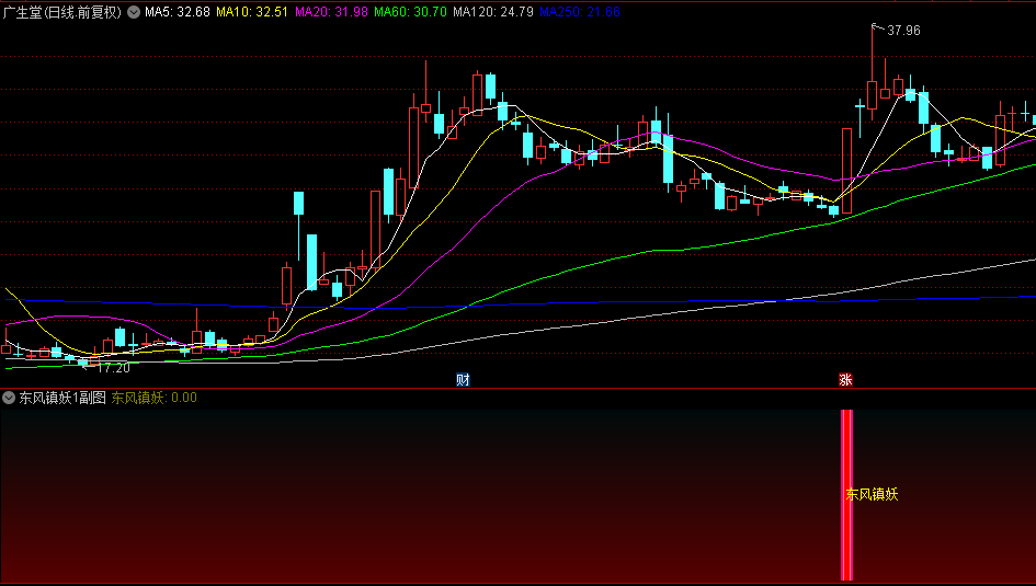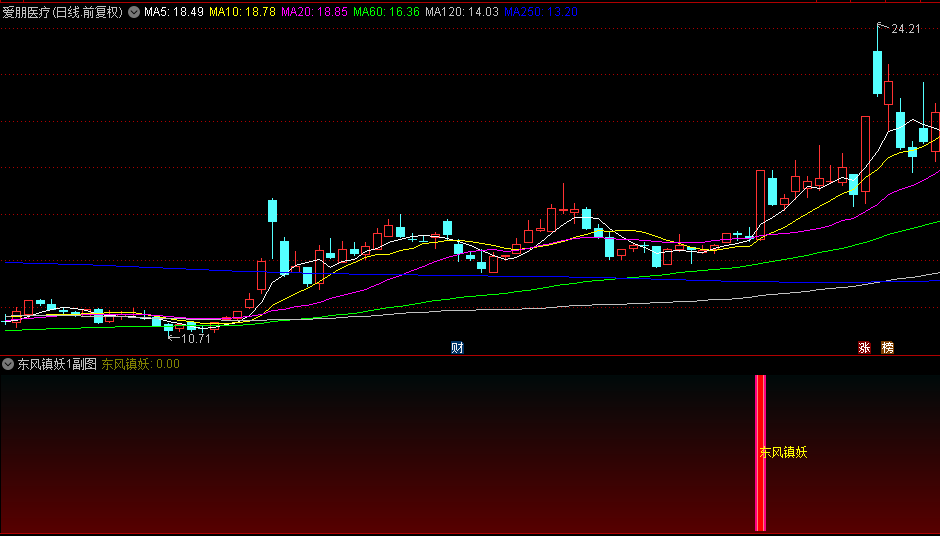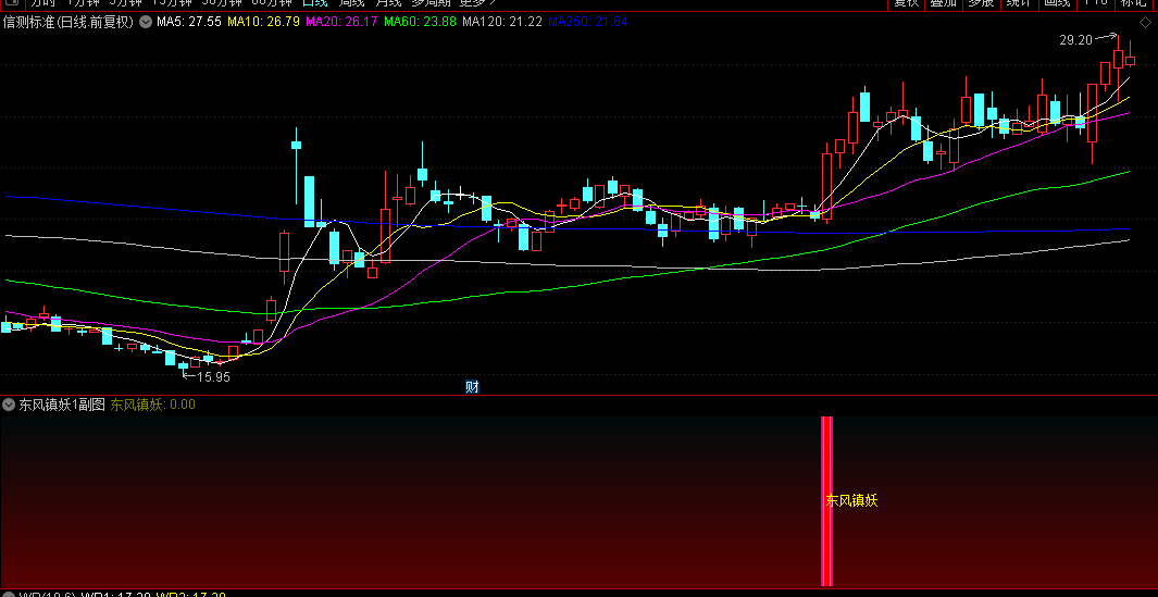信号输出:当所有条件满足时,【东风镇妖】指标将输出选股信号,并在图表上以醒目的红色棒状图和文字标注提示投资者。