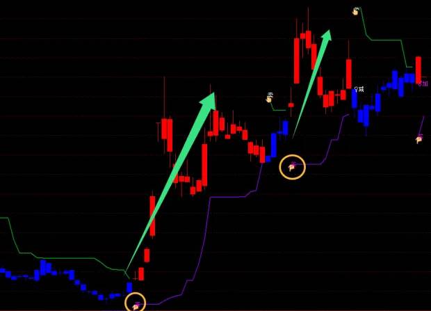 金手指向下,底部信号显现:当最近一个最高点出现的时间晚于最近一个最低点时,指标以蓝色粗线标出,