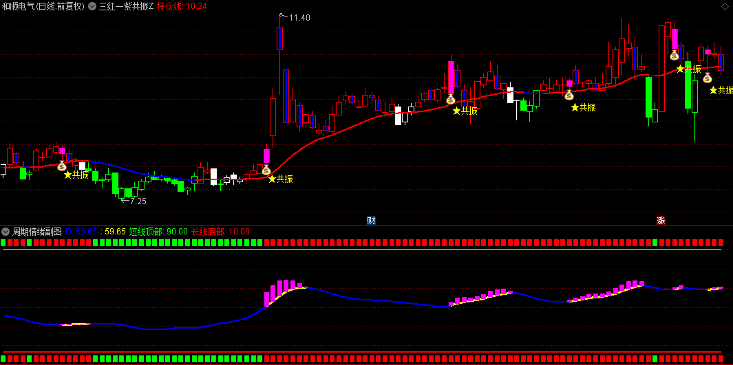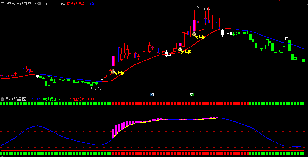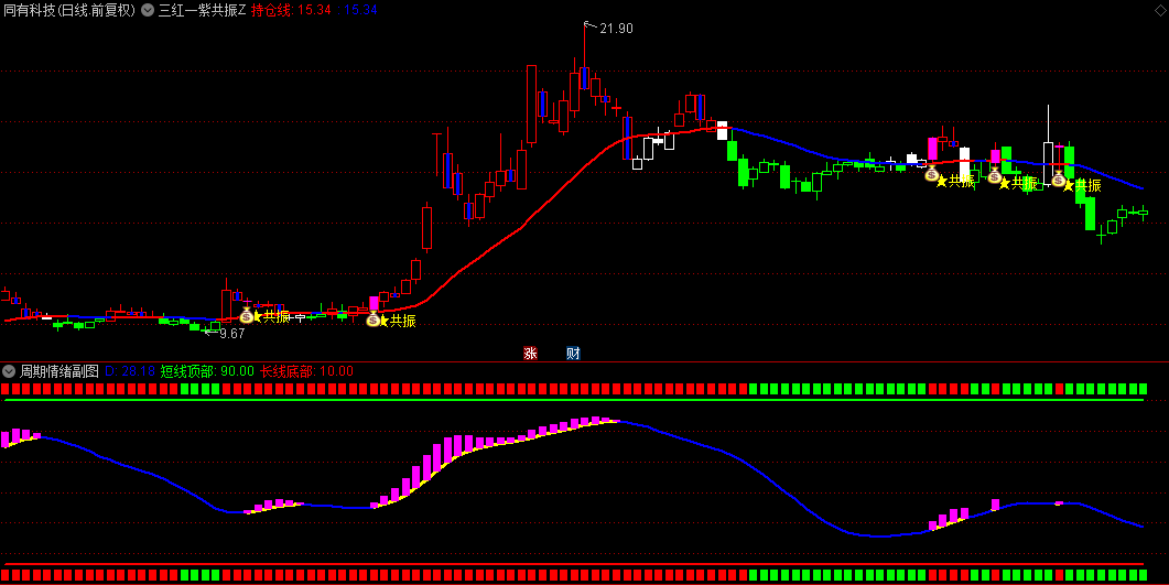 “三红共振”一词源于指标中的多个红色+紫色信号(共振)同时出现的情况。