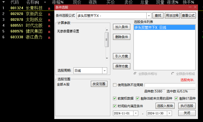 5、最后,多头双管齐下指标的核心选股逻辑综合了上述所有条件,并且要求开盘价相对于前一日收盘价的涨幅在0.9%至3.5%之间,这一区间既保证了股票的活跃度,又避免了过高开盘带来的追高风险。