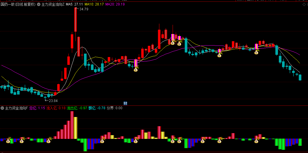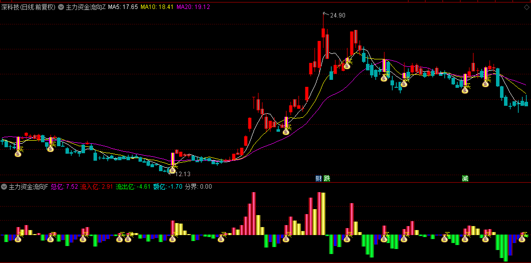 1、当主力资金由负转正且EMA(10)上穿前一值,同时伴随资金流入时,视为买入信号,并出现"钱袋子"图标及“买”字提示。