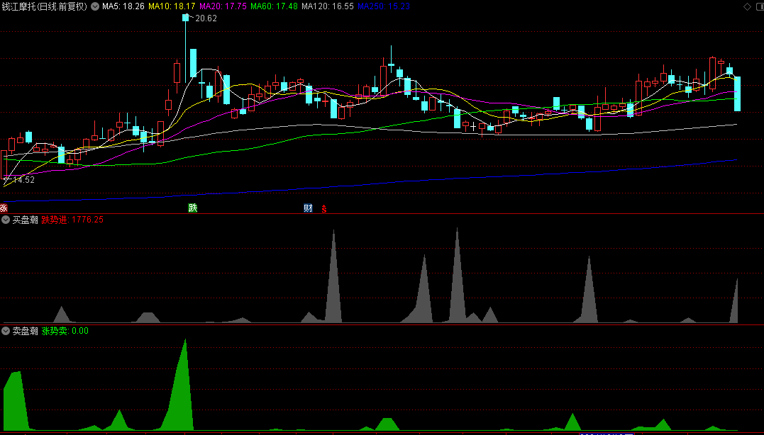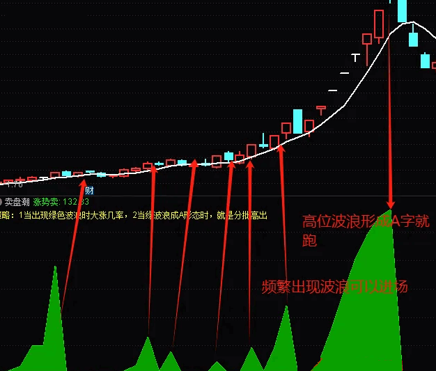卖盘潮就是资金开始拉升途中慢慢出货,当大资金出去时就会形成绿色A字波浪,那个时候就需要减仓或者清仓,大盘好则减仓,反之就卖,慢慢多对照一下自己的个股就懂了,