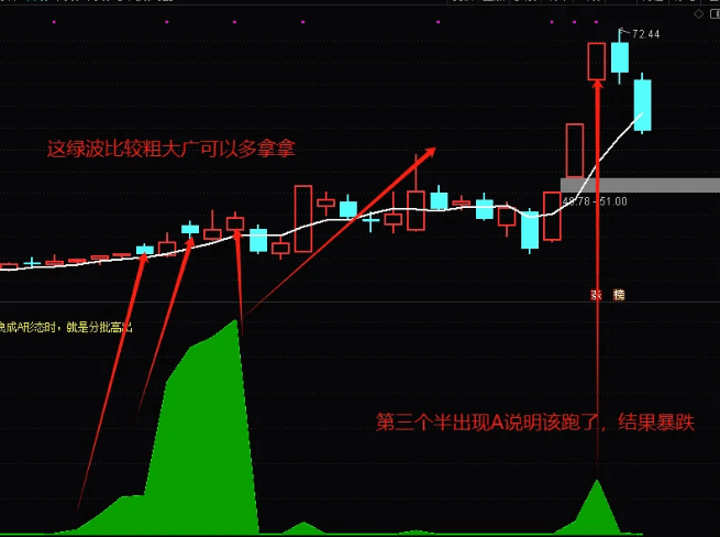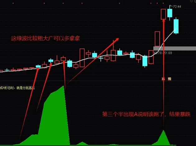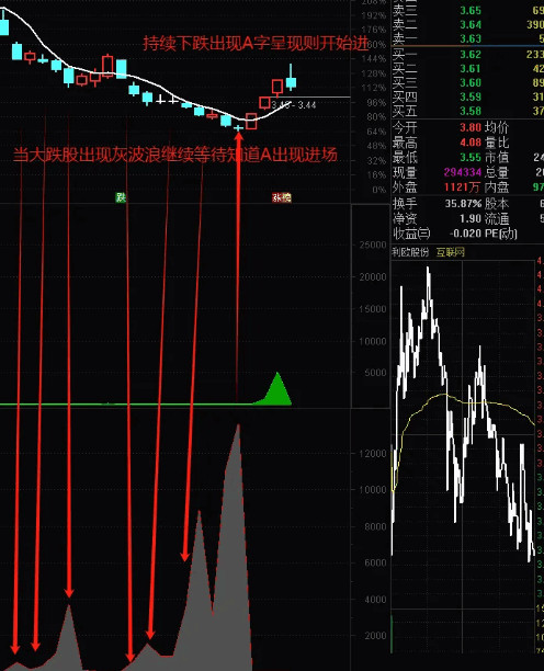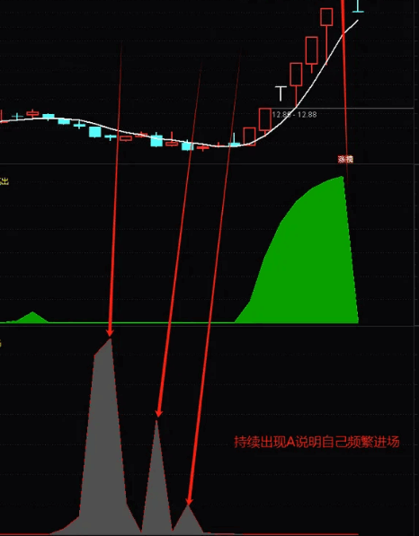 当出现灰色浪潮时关注,出现大面积灰色浪潮就要大胆进,当彻底形成A字时,就要注意高卖,因为资金已经从低拉到高,开始收网了,所以跑是没错的。