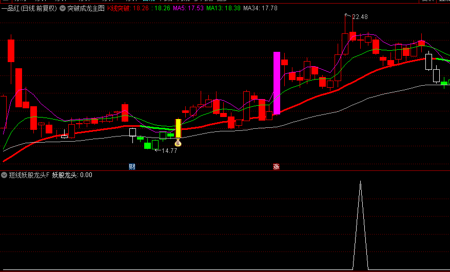 指标会在图表上标注出黄色的“★突破成龙”文字,并绘制红色棒状图,以提示投资者关注。