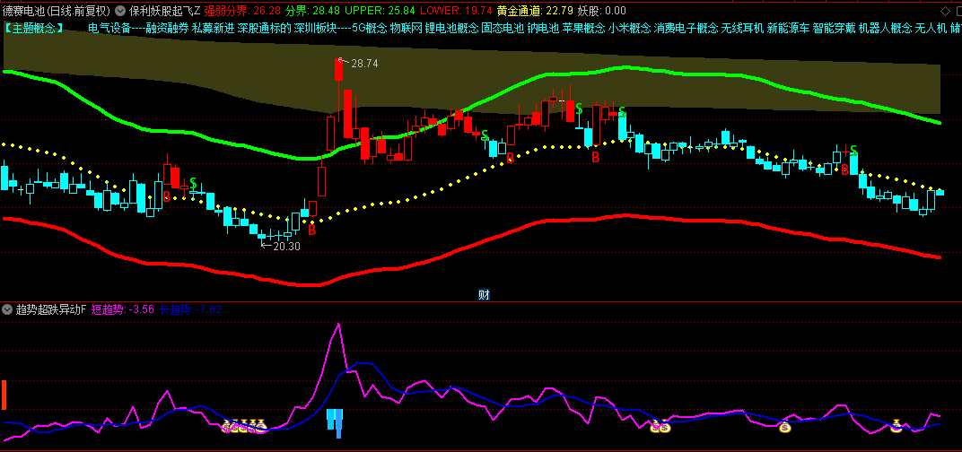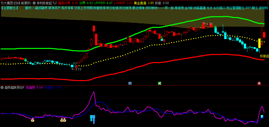 黄金通道:由UPPER上轨、LOWER下轨和黄金通道中线组成,通过计算一定周期内的价格移动平均线并加以调整,形成一个动态的通道,帮助投资者识别股价的运行轨道和潜在的突破点。