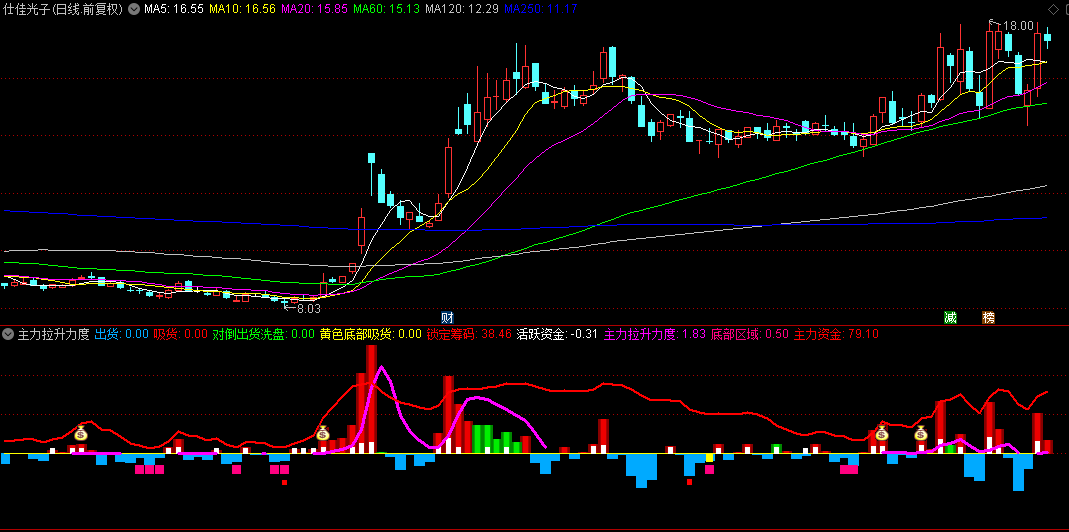 当主力拉升力度大于0时,意味着主力资金正在积极拉升股价,此时指标会用粉红色线进行标注。