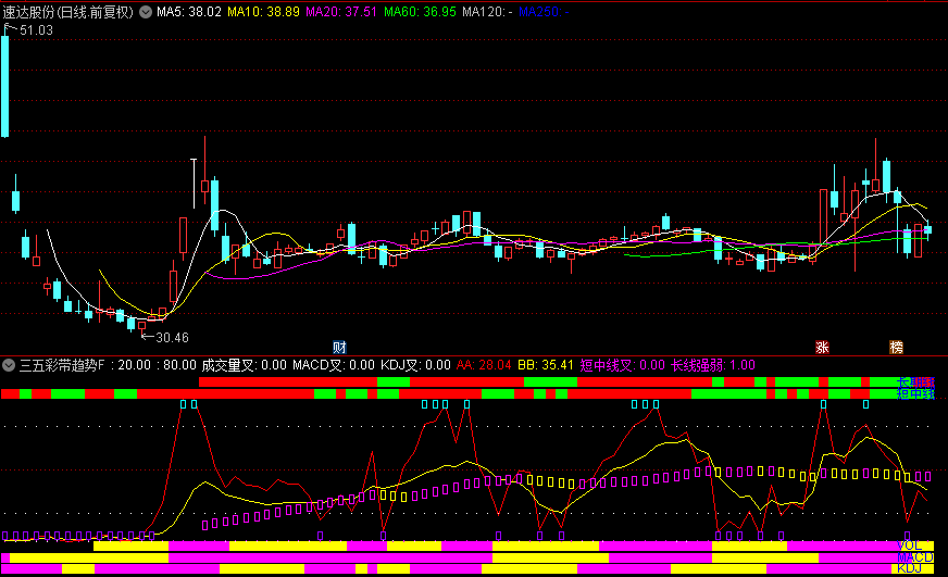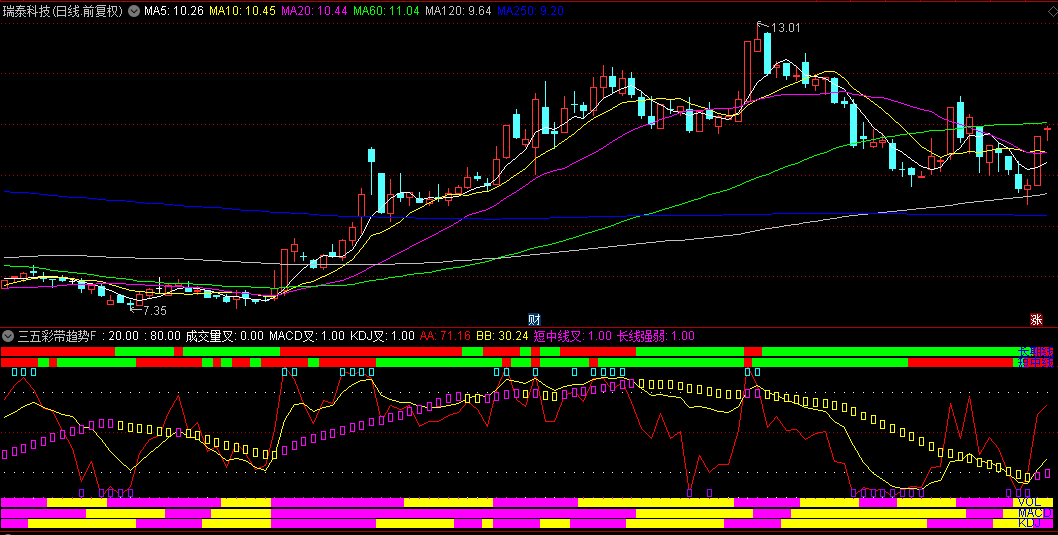 底部的三条彩带,如同股市的“晴雨表”,分别展示了5日、10日成交量的金叉或死叉状况,以及MACD、KDJ两大经典技术指标的动态变化。