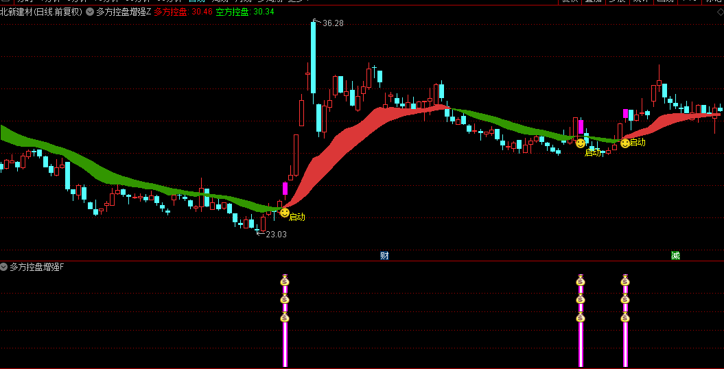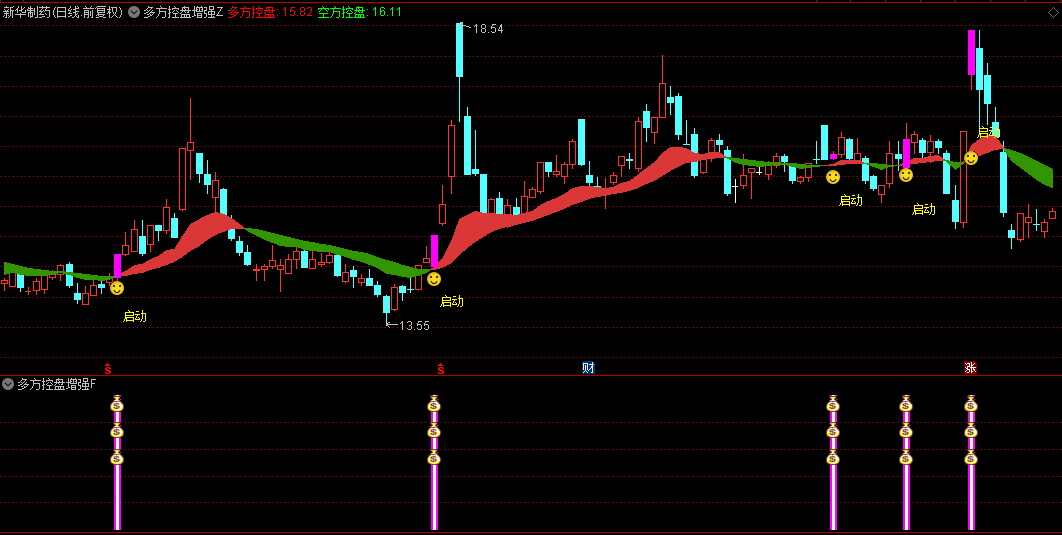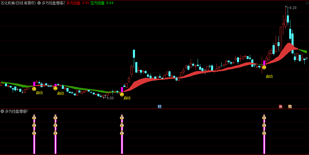 尤为值得一提的是,当多方控盘增强信号悄然降临时,对应的K线不仅会以紫色这一充满神秘与力量的色彩彰显其特殊性,还会在K线顶部镶嵌上一个“笑脸”图标,仿佛是在向投资者传递着市场多方力量正蓄势待发,买入或持有股票的时机已经成熟的喜讯。这样的设计,不仅让投资者在交易过程中感受到更多的乐趣和信心,也极大地提高了交易的准确性和成功率。