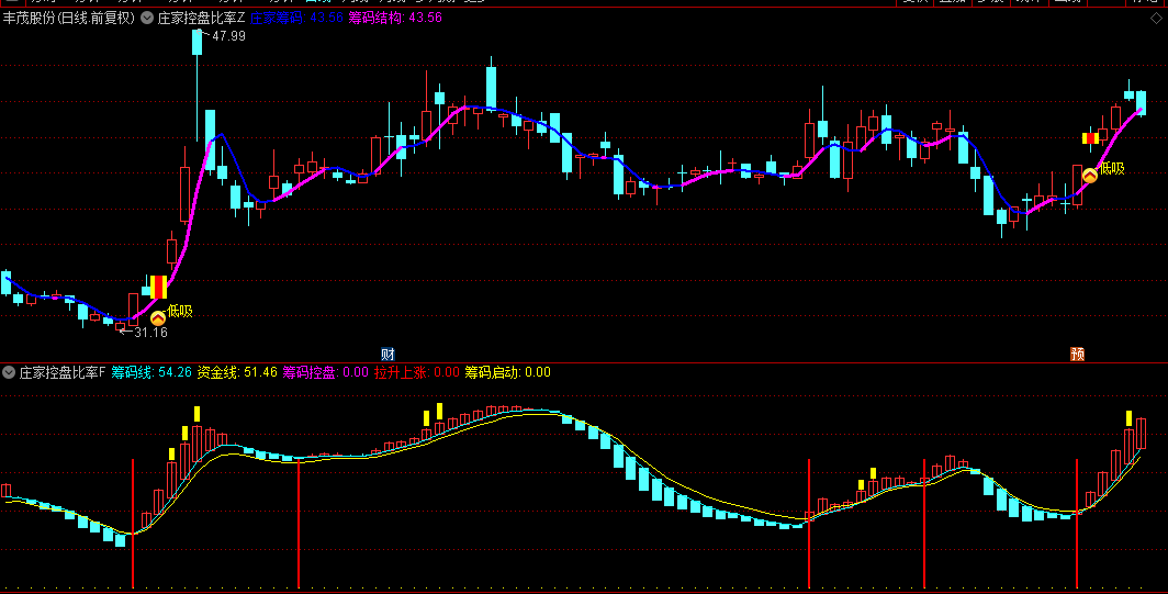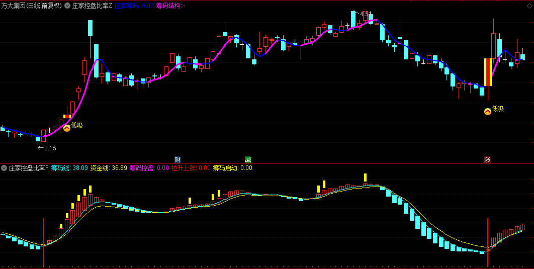 副图指标则更加深入地挖掘了市场价格的波动特性,通过一系列复杂的计算,如价格区间的相对位置、价格的动量变化等,构造出“筹码线”和“资金线”。