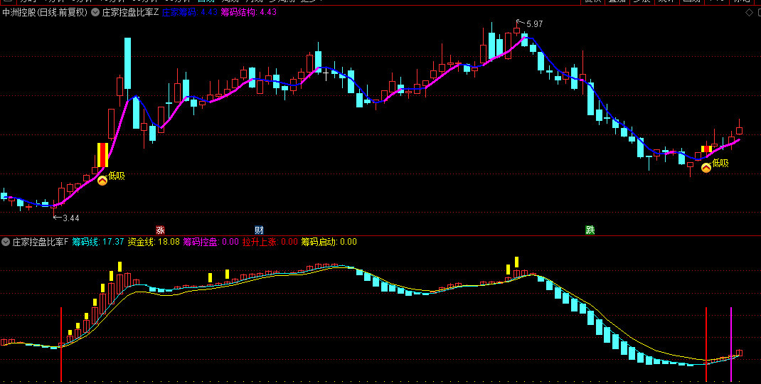【庄家控盘比率抄底】主图/副图/选股指标,寻找庄家的足迹,提醒可能的低吸买入时机!
