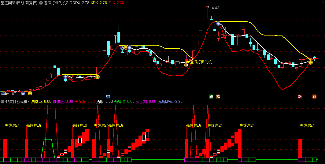 “游资打板先机”主图指标,通过一系列精心设计的计算公式,如移动平均线MA、最高值函数HHV、涨跌停价格计算ZTPRICE以及MACD指标等,构建了一个多维度的市场分析框架。