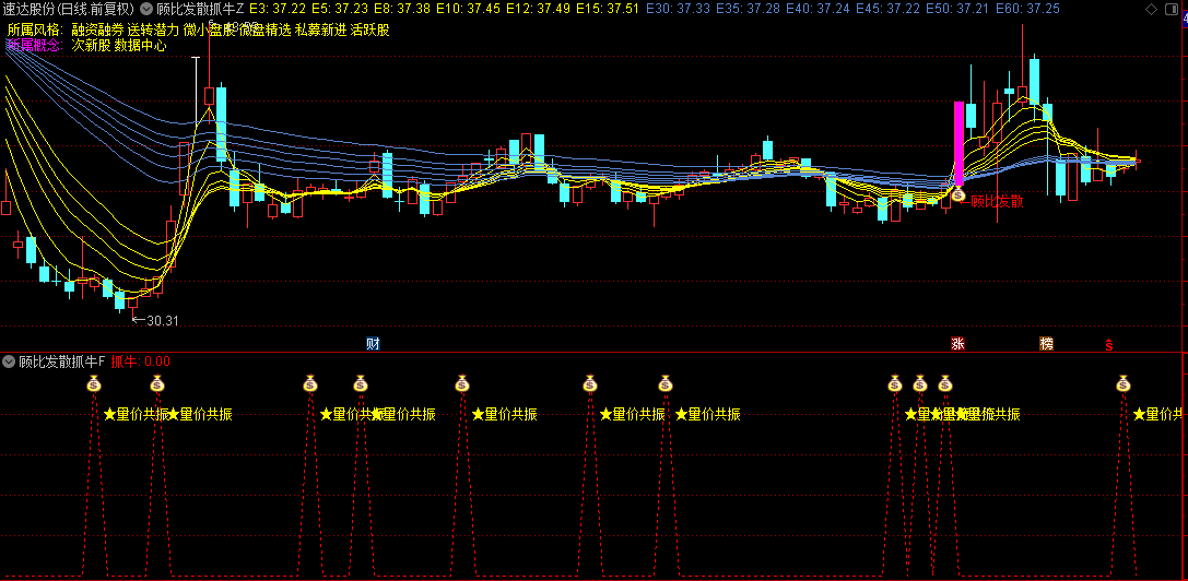 副图指标则通过计算16日移动平均线、1日和3日的简单移动平均线及其衍生指标,以及MACD指标等,进一步辅助投资者判断市场趋势。当特定条件满足时,如3日MA的1日MA在最近一次由下穿上3日MA的3日MA,且股价高于5日MA时,指标会发出“量价共振”的信号,用红色点线和黄色文字标注,提示投资者这可能是一个值得期待的买入时机。