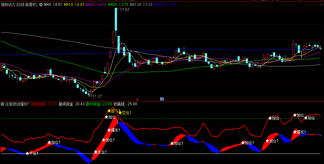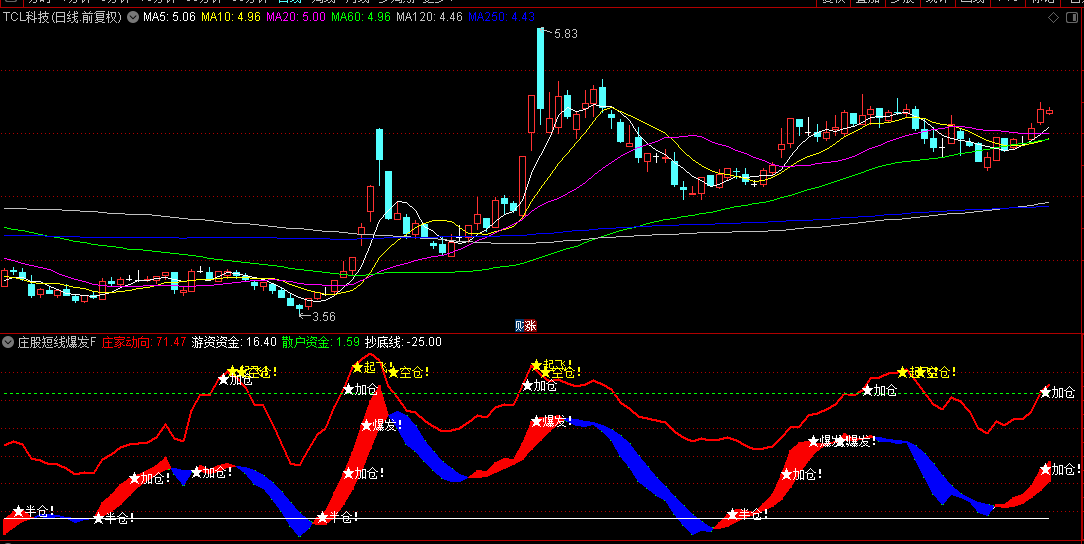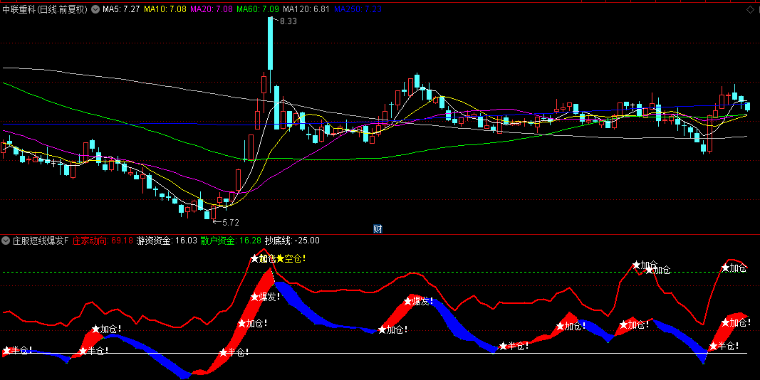 加仓与空仓提示:当庄家动向或游资资金达到特定阈值时,指标会以黄色或白色星星提示投资者加仓或空仓,如“★加仓”、“★空仓!”等。