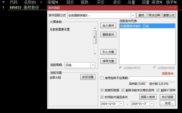 选股指标:将主图中的突破条件转化为选股公式,自动筛选出符合右侧强势突破标准的股票列表。投资者可以根据该列表快速定位潜在的投资机会。