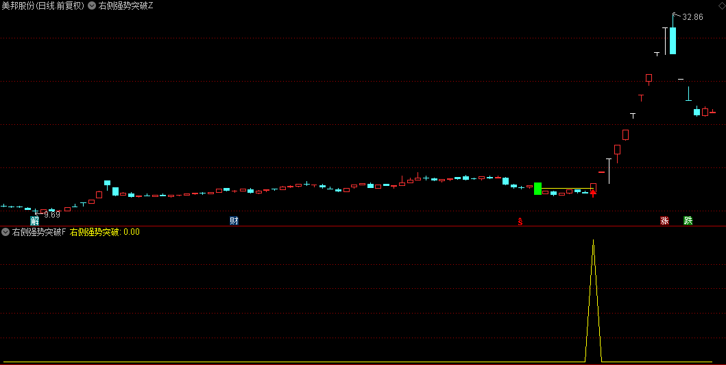 副图指标:通过重复主图中的关键条件筛选逻辑,以图形化方式展示股票在右侧强势突破时的动量、波动性和成交量变化,为投资者提供更直观的视觉辅助。