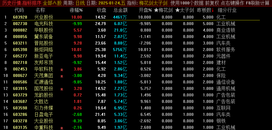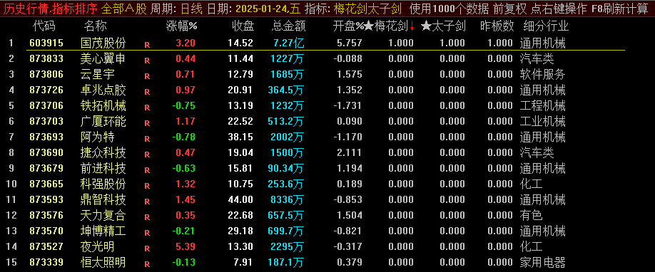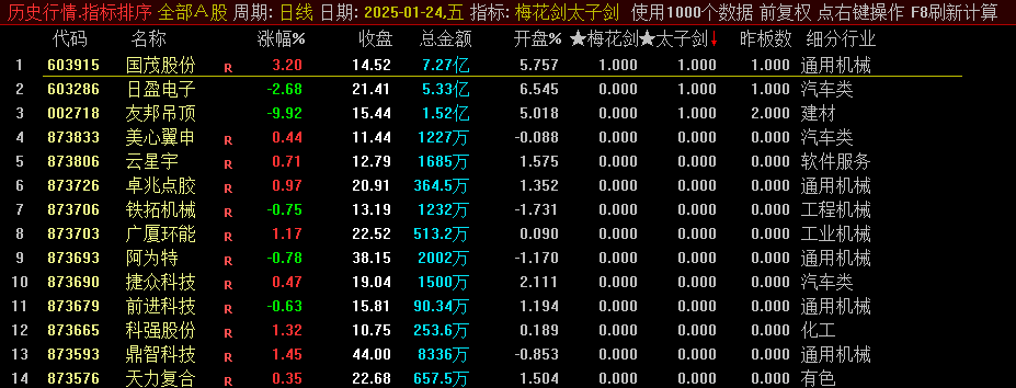 首要运用梅花剑,密切关注排名榜首的个股。需注意的是,信号并非每日皆有,若无信号,则转而关注太子剑的排序结果。