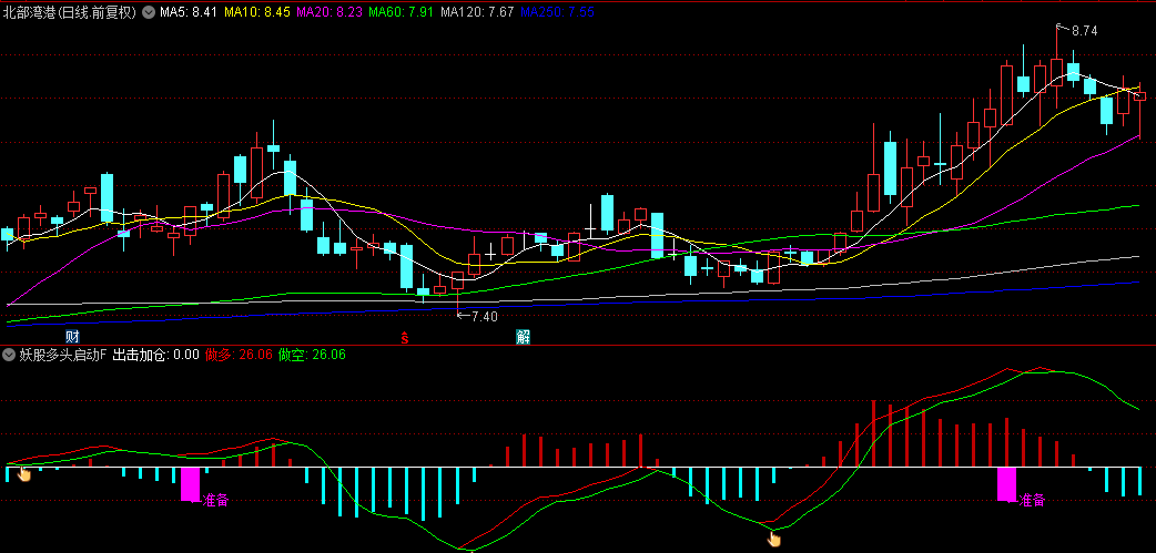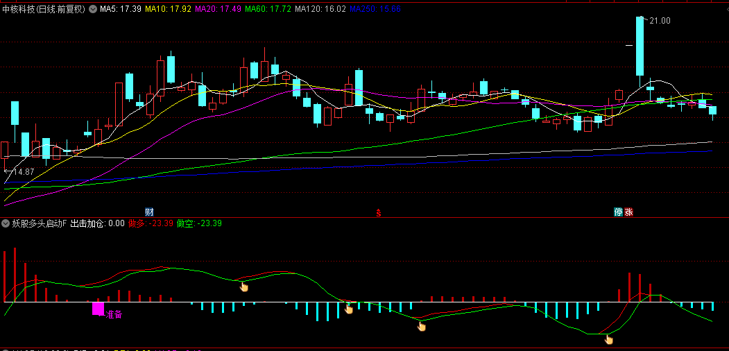 在副图指标中,红色与绿色曲线交织,分别象征着市场中的做多力量与做空力量之强弱。