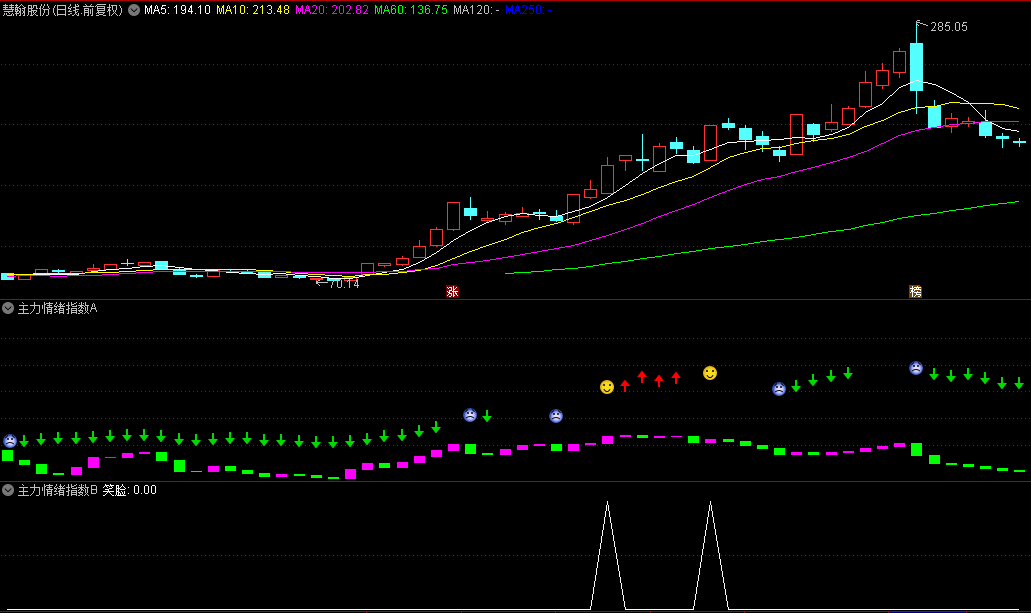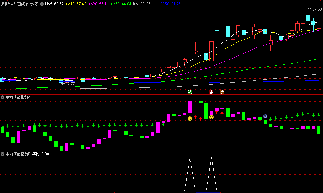 当情绪指数大于60时,在图表上方显示特定图标,表示市场主力情绪高涨。