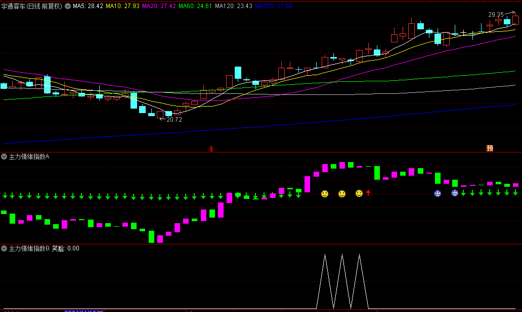 主力情绪指数B副图与A副图在核心逻辑和计算方式上基本一致,但在图形表现上更为简洁,主要突出了笑脸信号,