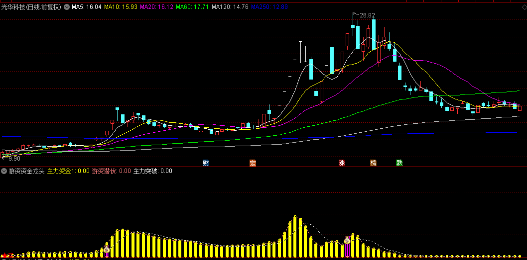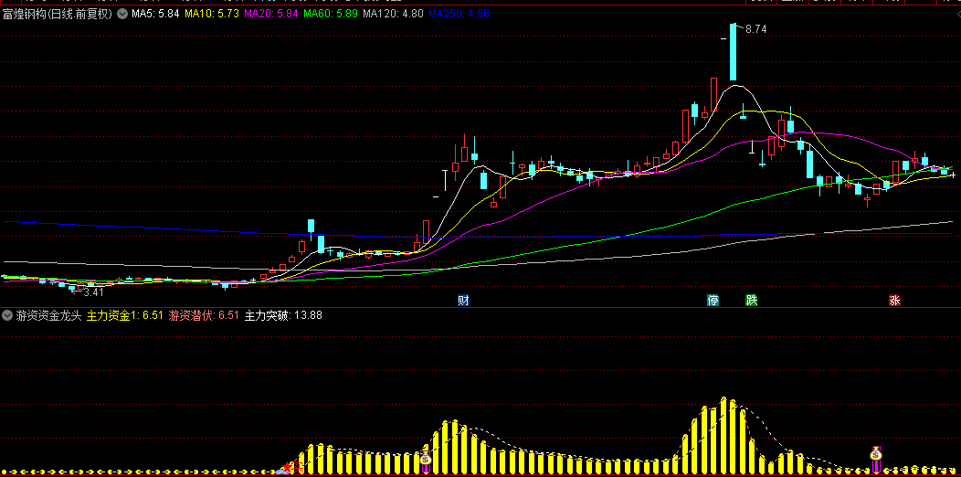 主力资金与游资潜伏:以黄色柱体和特定颜色线条展示主力资金的流入情况,同时用不同线条标识出游资的潜伏与突破趋势,为投资者提供多维度的市场分析视角。