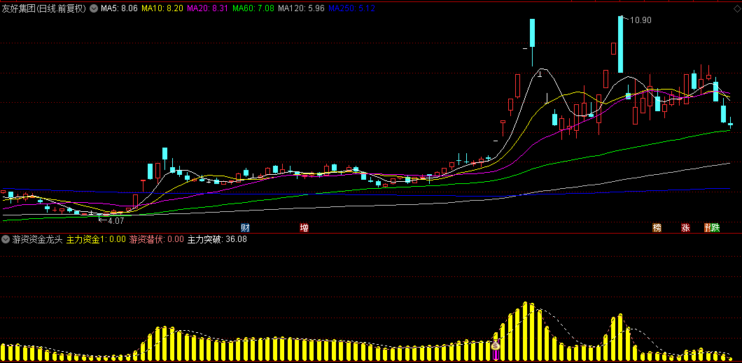 黄色柱体:这是主力资金流入的明确信号。当黄色柱体出现时,意味着市场中的大资金正在积极介入,股价往往伴随着上升的动力,是投资者关注并可能介入的时机。