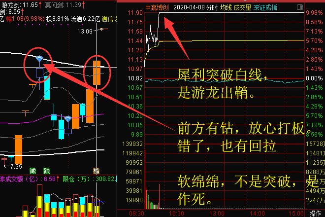 只要K线突破上图白线,就形成了游龙出鞘!这工具是操盘手内部抓启动板,半路、打板的绝招。需要注意的是,游龙出鞘的力度要够强,弱不拉几凑个图形的样子货,无效。结合龙头战法的精髓使用,功效最大。