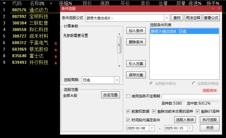 选股部分是基于主图和副图的逻辑判断,筛选出符合特定条件的股票。