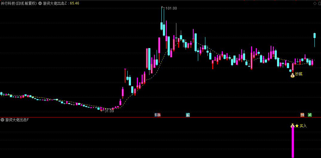“游资大佬出击”指标基于多种股票技术理论,通过精细的计算和复杂的逻辑判断,准确捕捉市场底部的买入机会。
