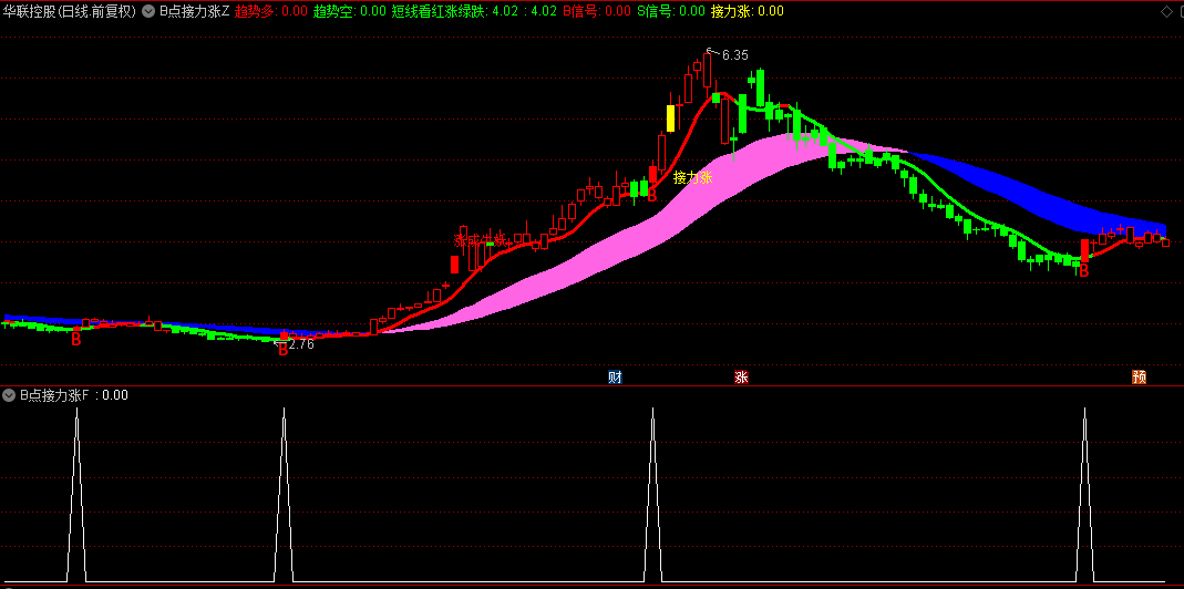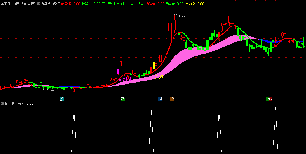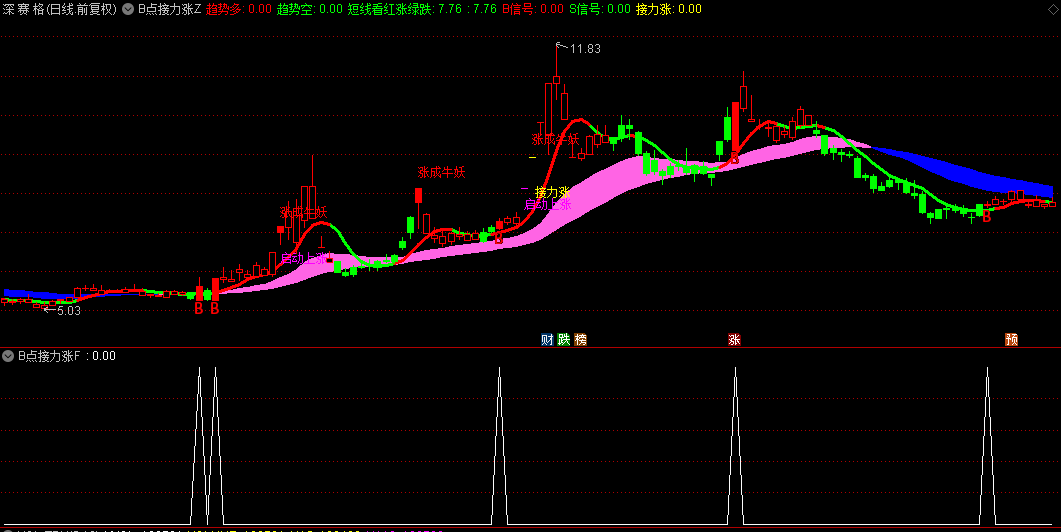主图中的信号有四个提示,分别是“接力涨”、“启动上涨”、“涨成牛妖”和B;