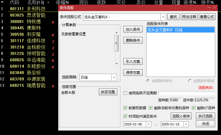 投资者在使用【龙头金叉套利】指标时,应重点关注那些符合所有筛选条件的个股。