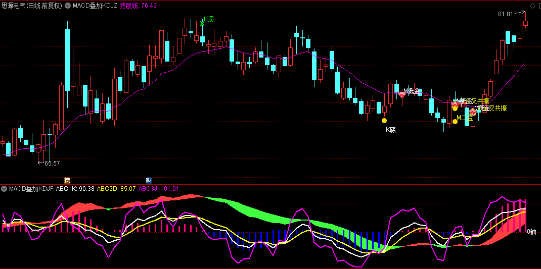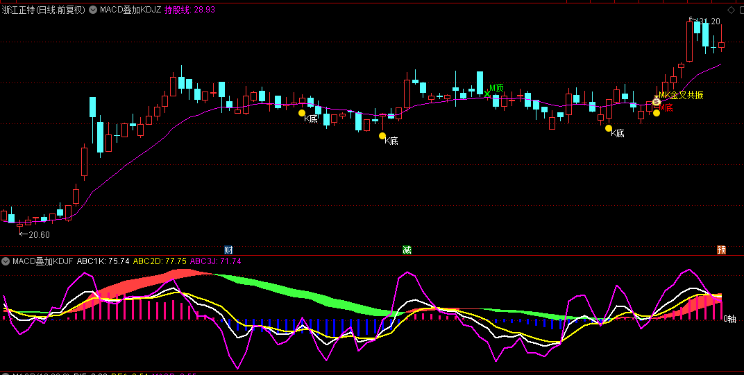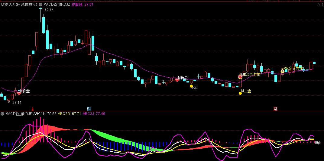 在副图部分,该指标将MACD与KDJ叠加展示,并进行了视觉上的优化处理: