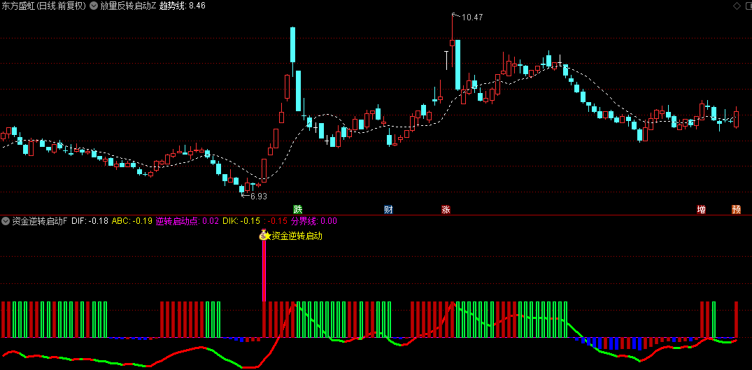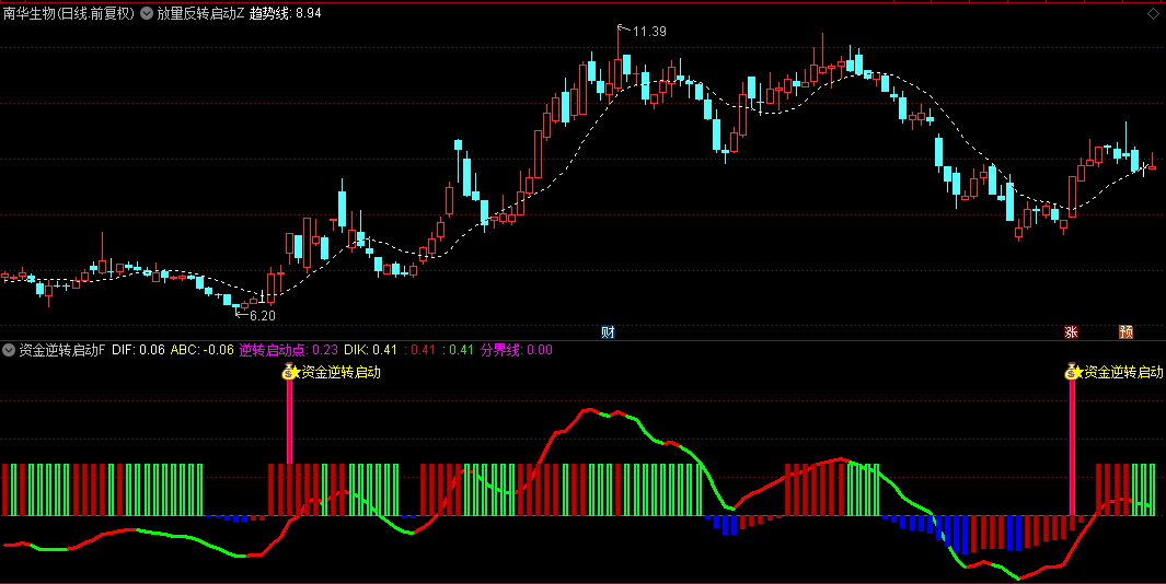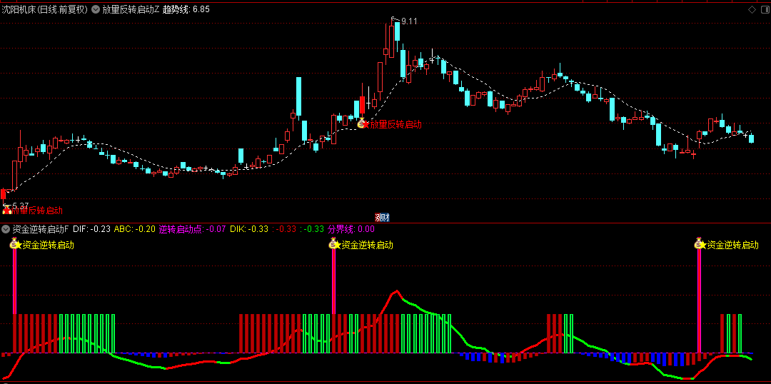 副图指标进一步结合CCI指标和成交量加权的价格指数,通过复杂的计算逻辑来确认股票的放量反转启动信号,为投资者提供更详细的辅助判断。