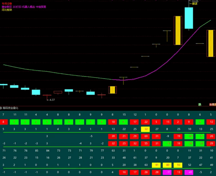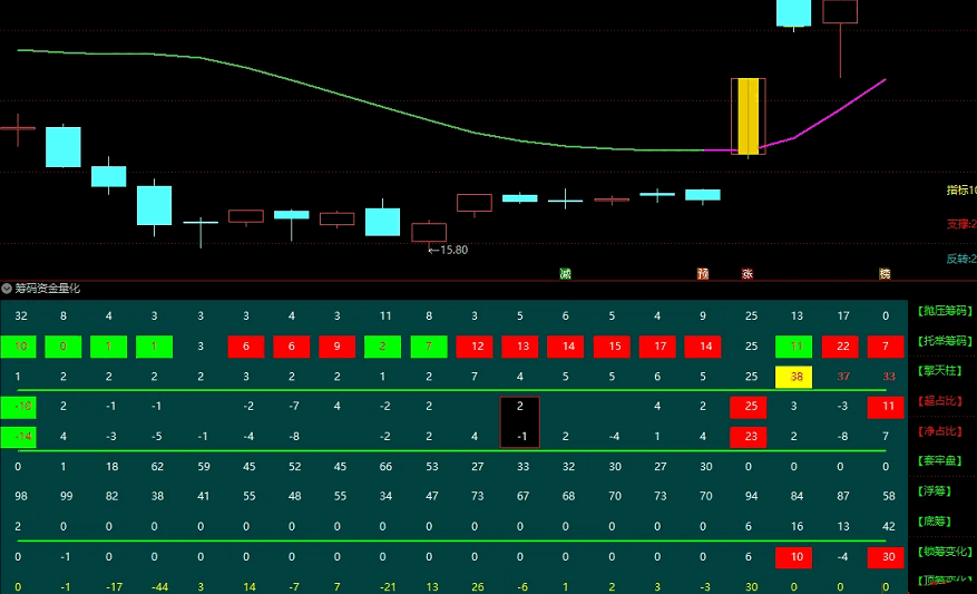 6、浮筹与底筹变化:当(昨浮筹-浮筹)>=30且(底筹-昨底筹)>=30时,底色变黄,这通常意味着股价已经摆脱了前期的浮筹压力,底部筹码更加稳固,上涨空间被打开。