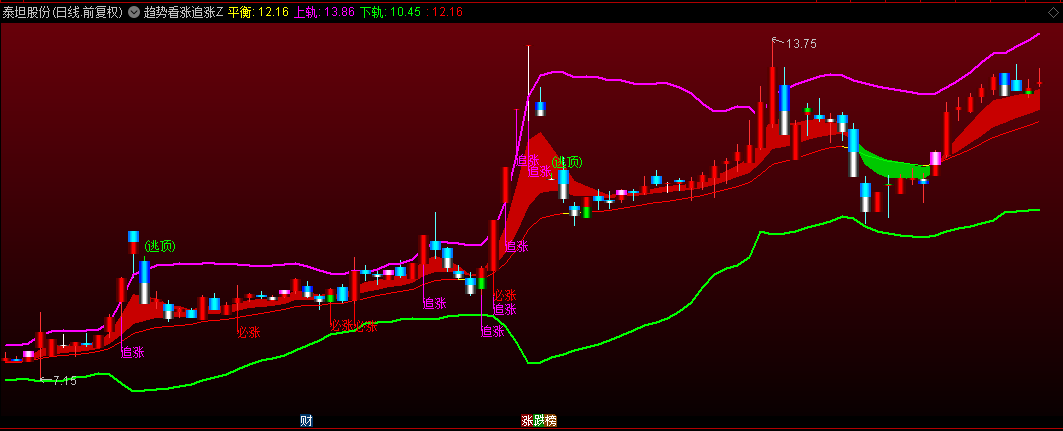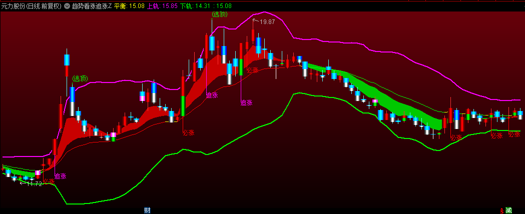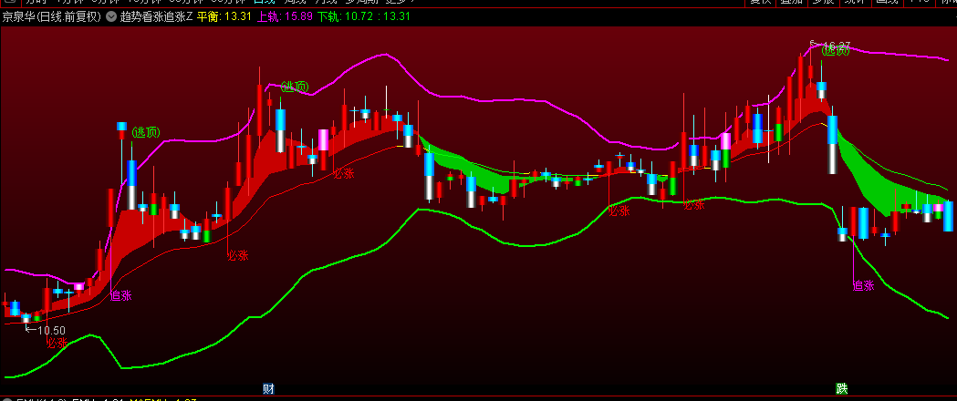 当股票出现大幅上涨且收盘价接近最高价时,指标会发出追涨信号,并在低位显示追涨字样,颜色为亮紫色。这有助于投资者捕捉股票的短期上涨机会。
