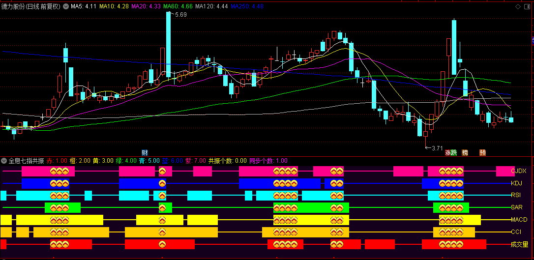 通达信【全息七指共振】副图指标巧妙地将多个常用的技术指标融为一体,
