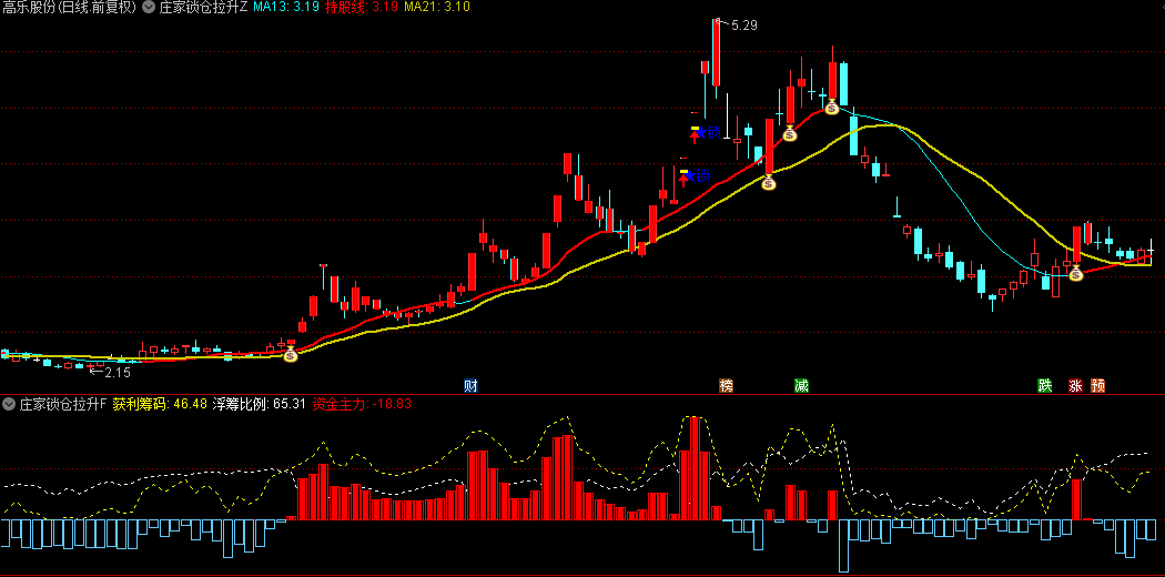 资金主力:以红色柱线显示获利筹码与浮筹比例的差值,即资金主力的动向。当资金主力大于0时,以加粗红色柱线强调,提示资金流入。