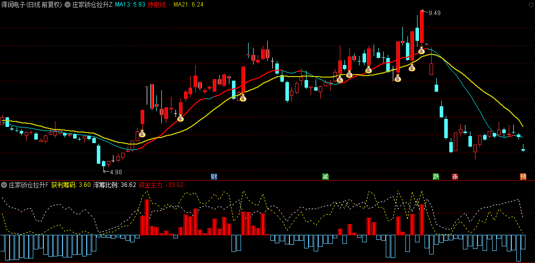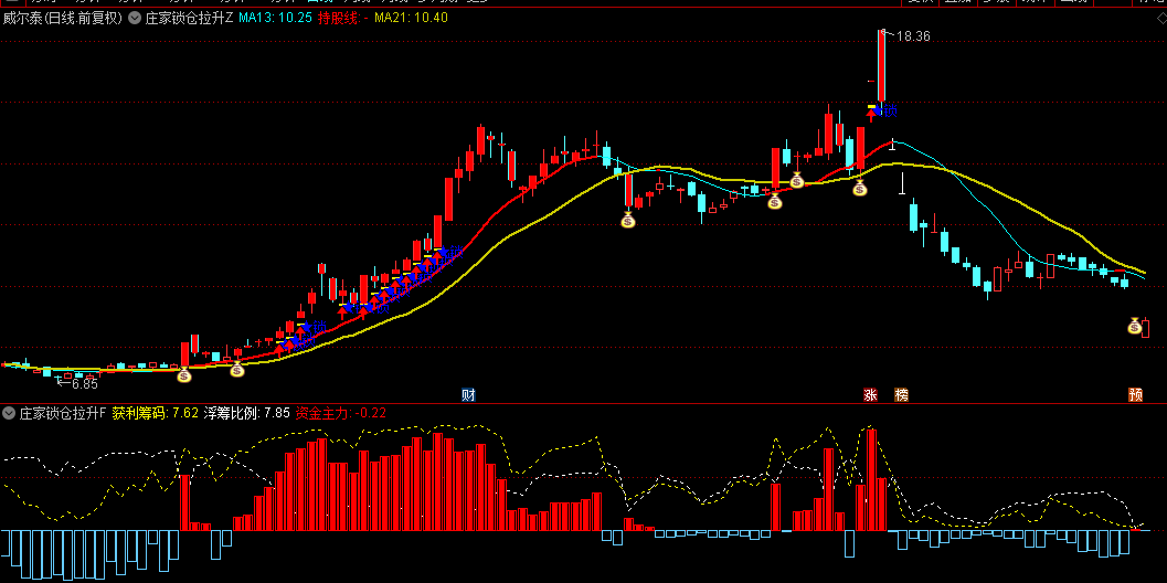 获利筹码:以黄色点线显示,反映当前价位下的获利筹码比例。