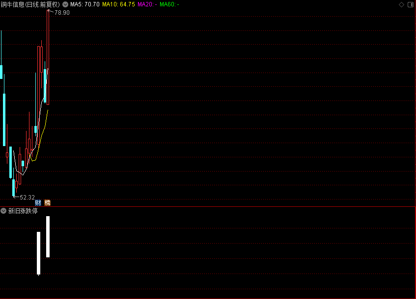 DRAWTEXT(涨停 AND 跌停 AND PERIOD=5,L-0.05,'天地板'),COLORCC00CC;{从跌停到涨停}