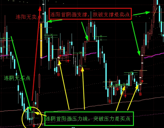 比如连阴后反复出现阴阳相间的K线,压力线始终在阳线的前一日阴线的最高点;