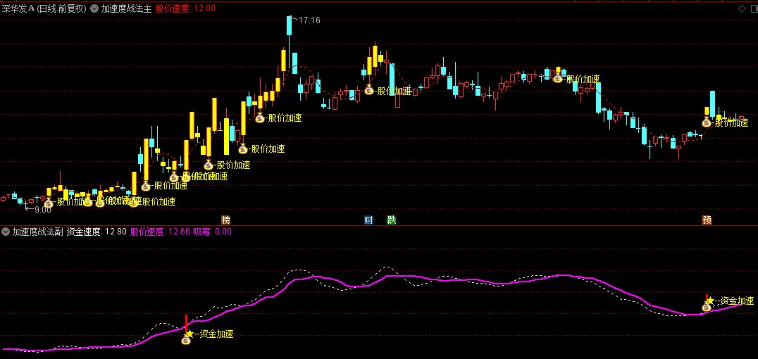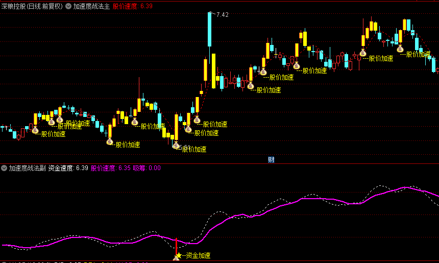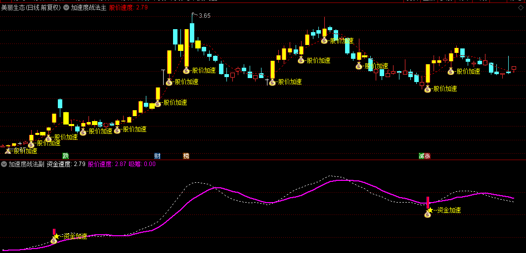 在主图中,该指标通过对股价的历史数据进行一系列的统计和分析来确定股价是否处于加速状态。可能运用到的方法包括计算股价的短期涨幅、涨幅的变化率等。例如,通过比较不同时间段内股价的涨幅,如果发现近期股价涨幅相较于之前明显增大,且呈现出持续上升的趋势,就可以判定股价处于加速上涨阶段。这种计算方式能够敏锐地捕捉到股价上涨动力的增强,为投资者提供股价加速的信号。