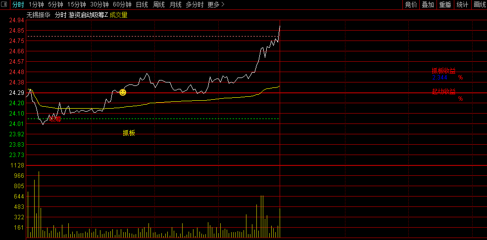 本指标专为分时主图设计,集吸筹、分时启动、抓板三大确定性买点于一身。