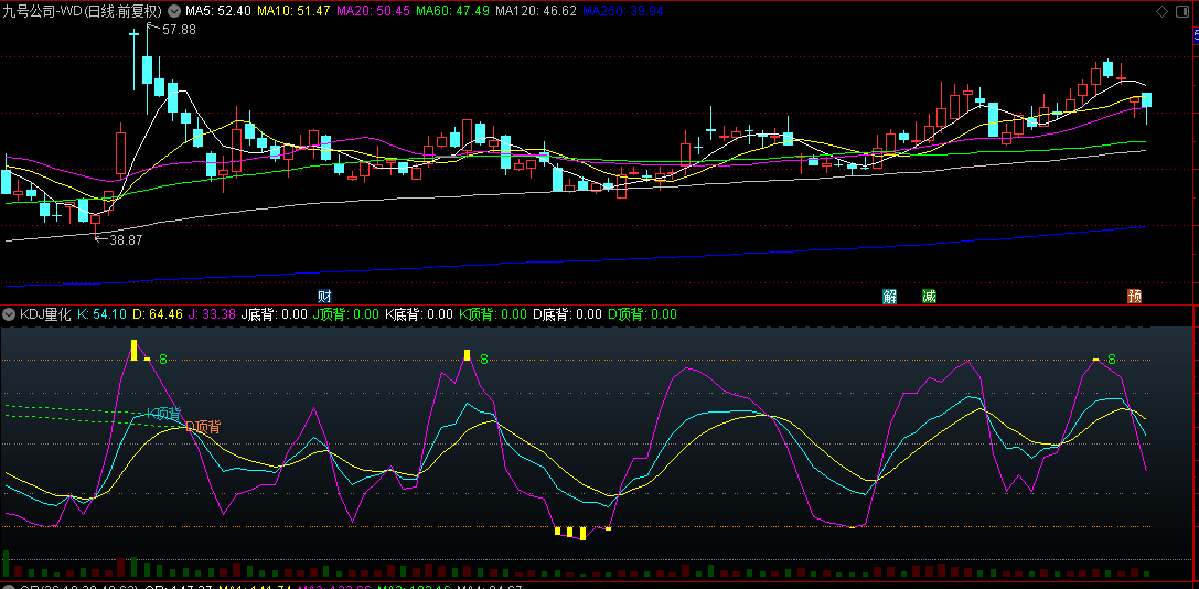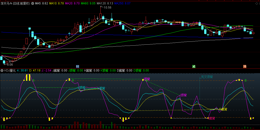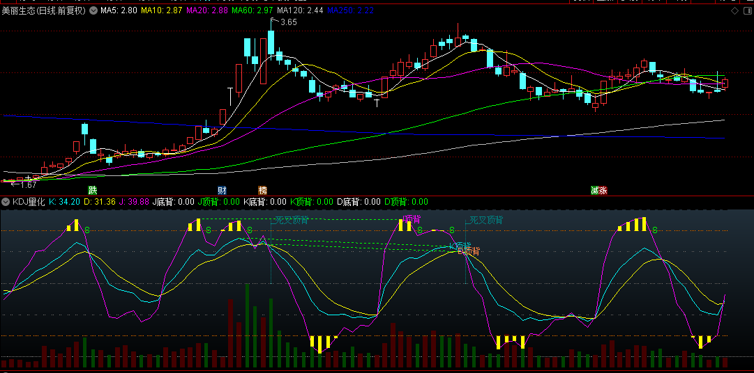 系统标配KDJ过于简约了,如果光看金叉死叉机械地买卖成功率不算高,要提高成功率,就要加入顶背离、底背离信号决策,如果再与成交量配合,就可以过滤许多无效信号。