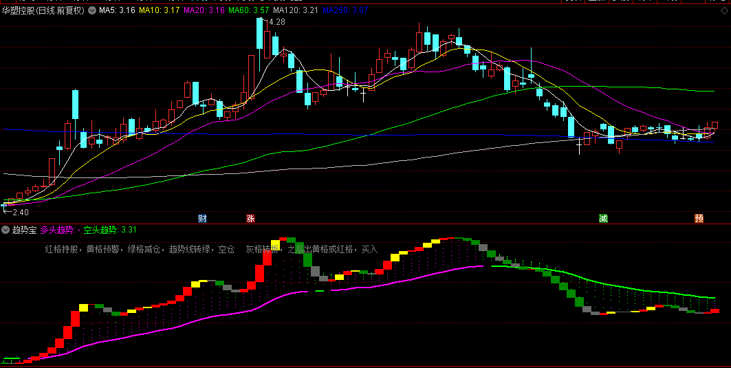 3、回踩趋势线(在趋势线走平或向上的前提下),见到第一个黄格或红格就回补买入。
