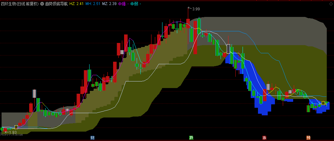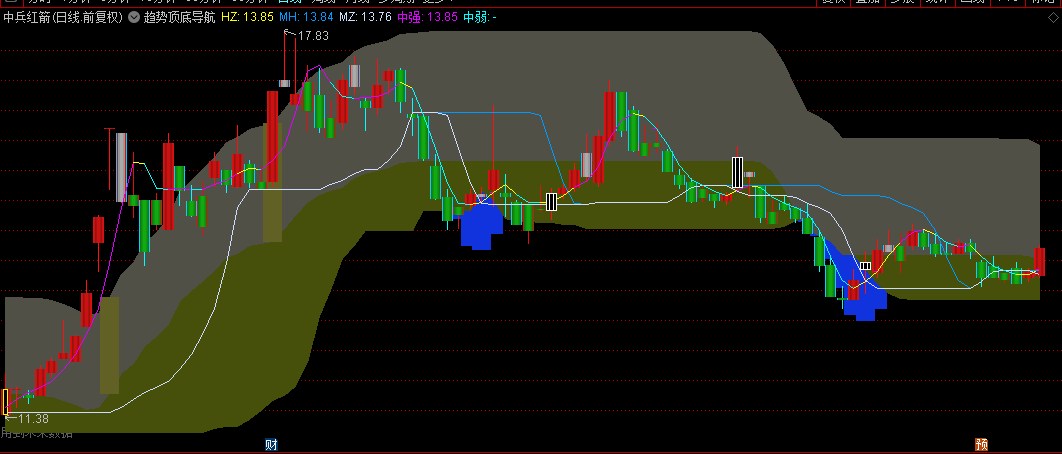 指标中通过绘制趋势带,将股价的波动限制在一定的范围内。同时,结合不同颜色与样式的价格线,直观地展示了股价的强弱变化。