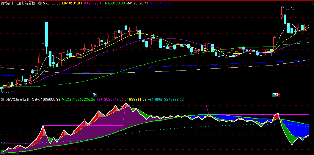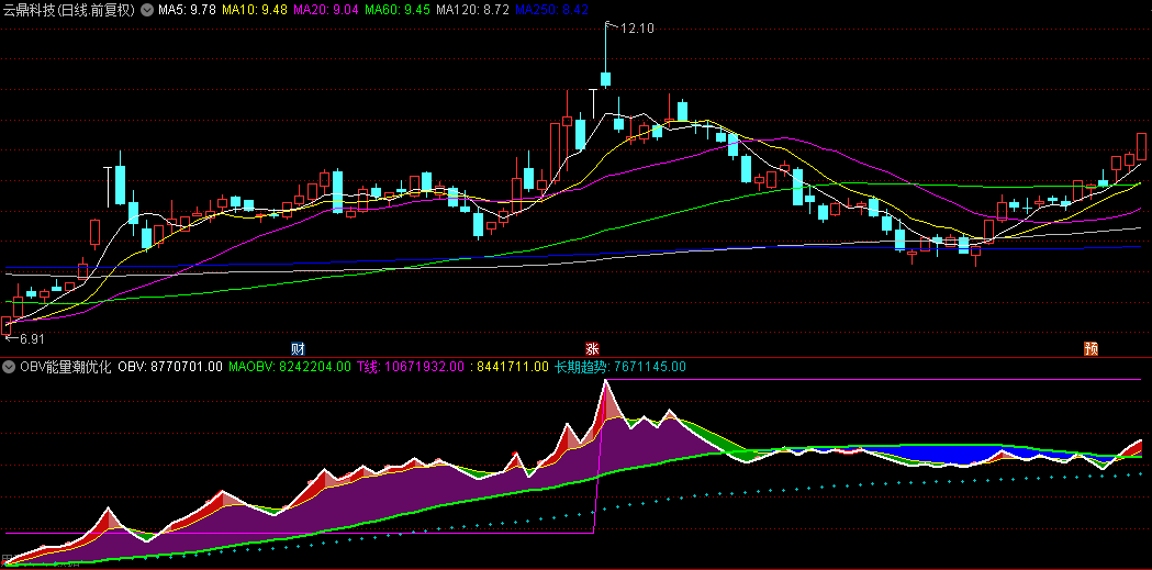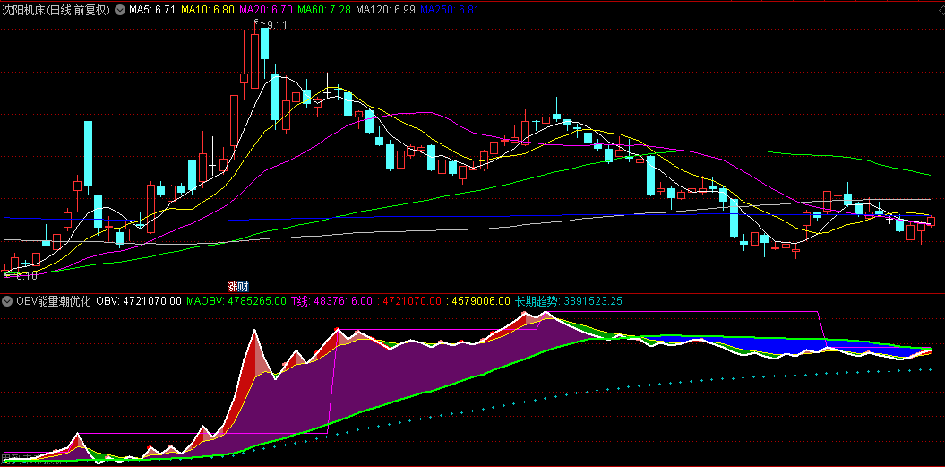 通达信【OBV能量潮优化】副图指标,增加色块与短线长线均线,一眼看出买卖,更及时直观!