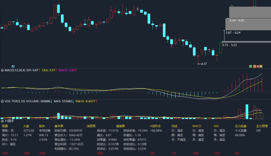 图表中是冀凯股份,这只票三连板,在副图11因子中清晰地量化出11个因子的分值和整体总分。这11个因子从大局观市场环境,看大盘指数,到板块联动,看板块指数,再到个股的基本面、消息面、情绪面、K线形态、辅助指标,相应给出这些因子评分权重,合计100分,在情绪面中,换手、量比、封单量、封流比、封成比这些指标是判断股票能否继续连板的关键。