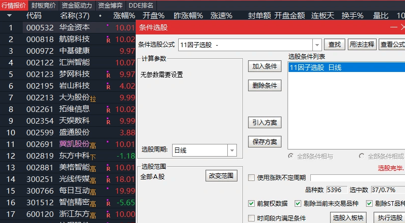 连续两个帖子都在讨论捕捉妖股,妖股的诞生是从涨停板启动逐步走出来的,市场上捕捉龙头或者妖股,不是始终都有很好的跟随机会,那么不妨从首板开始物色,然后一进二,二进三,模式化操作,通过胜率来赢取极大的复利利润,这为许多柚子大佬们实践证明是一条暴富捷径。如何捕捉涨停板,自然要学习一些战法和上车技巧,但对于涨停板的特征把握和市场情绪的认知是需要修炼的内功,还有就是要有好的辅助工具。涨停板是可以量化分析他有哪些因子构成。曾经有位游资大佬讲过课,他解析了涨停有11个因子。本人认真演习了他的讲解,试图编写出11因子选股公式,还真的就编写出来了,在此简单演示一下公式编写思路和选股方法。