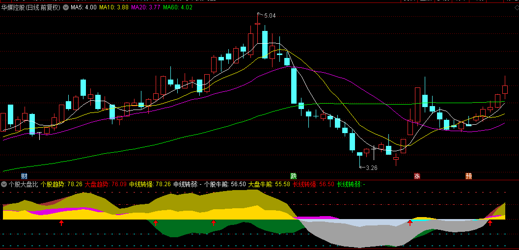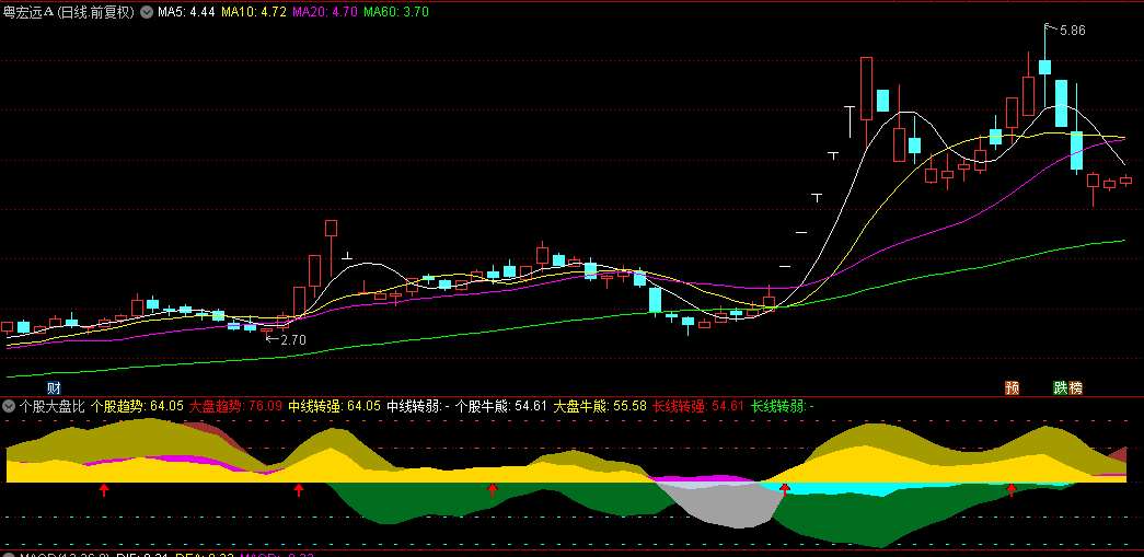 而图3,神州数码,之前的走势与大盘契合,也就是近期才异动,开始强于大盘,大盘线在零轴下方,它在上方,大盘线涨少,它涨多。
